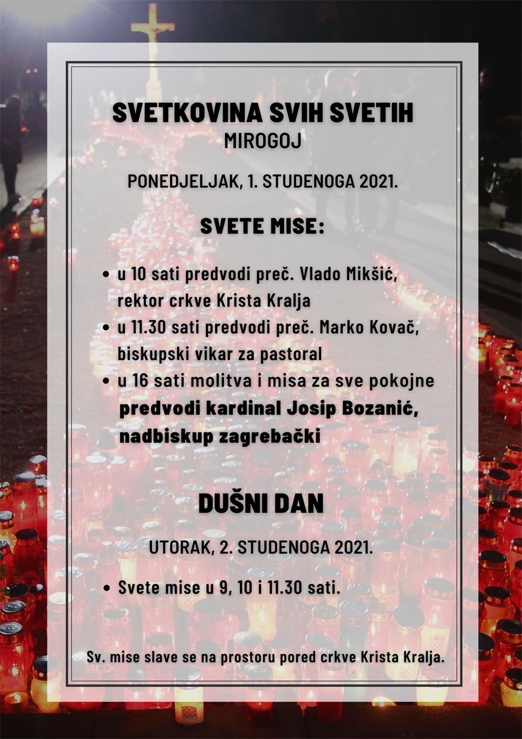 Na svetkovinu Svih svetih u ponedjeljak 1. studenoga 2021. svete mise na groblju Mirogoj bit će u 10, 11.30 i 16 sati.