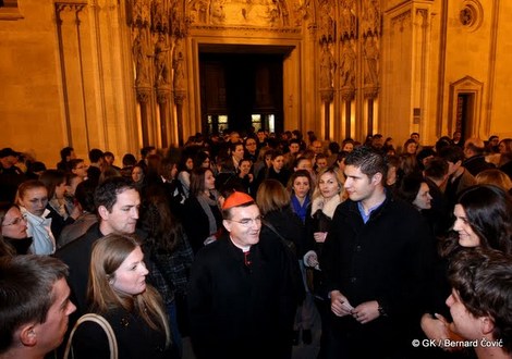 Foto: Kardinal Bozanić s mladima ispred Katedrale nakon jednog od niza susreta s mladima u okviru "Misija u gradovima"