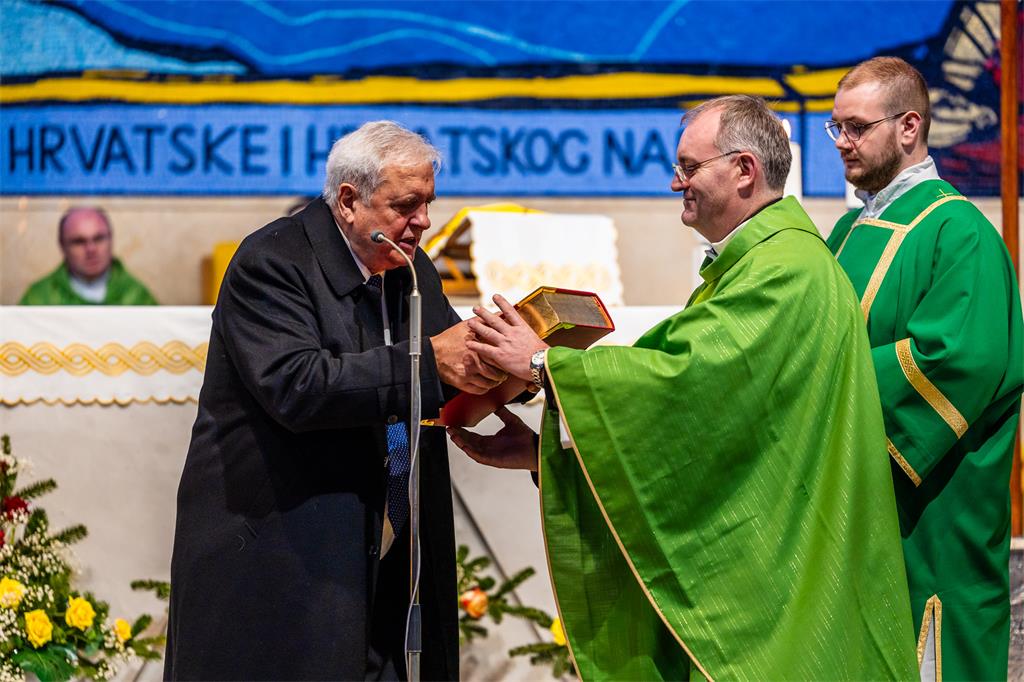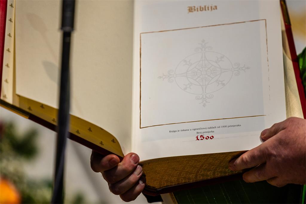 "Prije dosta godina, za vrijeme pontifikata svetog Ivana Pavla II., štampana je 'Zlatna Biblija' u 1500 primjeraka na hrvatskom jeziku opremljena vrhunskim reprodukcijama slikovnih umjetničkih biblijskih prikaza. Kako sam poznavao ljude iz organizacijskog odbora, tako sam im predložio da upravo ja otkupim prvi primjerak tog posebnog izdanja Biblije. Tada su mi odgovorili da je prvi primjerak rezerviran za samog papu Ivana Pavla II. Onda sam zatražio da otkupim zadnji odnosno 1500. primjerak. Iako ga tada još nisu ni otisnuli, ja sam ga rezervirao i naravno kupio i čuvao ga kod svoje obitelji sve do danas. Sve ove godine dobivao sam više ponuda za otkup zadnjeg primjerka 'Zlatne Biblije'. Ni sam ne znam zašto se nisam htio od nje odvojiti. Očito ju je Bog odredio da bude ovdje u ovom svetištu sv. Josipa, zaštitnika naše domovine Hrvatske. I evo, ovu 'Zlatnu Bibliju', 1500. zadnji primjerak ovog izdanja, dragi moj mons. Antune Sente, predajem Vama kao čuvaru hrvatskog Nacionalnog svetišta sv. Josipa u Karlovcu, da je čuvate te bude dragom Bogu na slavu, a hrvatskom narodu na spas i blagoslov. Uz sam dar dostavljam i vlasnički list ovjeren kod javnog bilježnika. Uvjeren sam da je sada ova 'Zlatna Biblija' konačno na pravom mjestu. Hvala ti Bože, ovo je za mene izniman događaj", zaključio je gospodin Maržić.