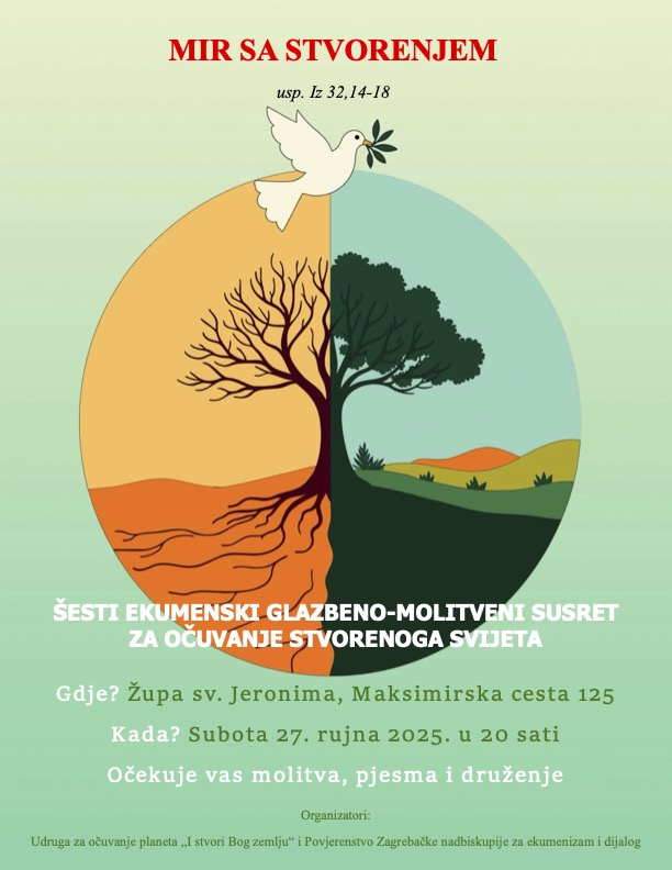 U subotu 27. rujna u 20 sati u župnoj crkvi sv. Jeronima u Zagrebu održat će se Šesti ekumenski glazbeno-molitveni susret u znaku poruke „Mir sa stvorenjem”, u sklopu svjetskog obilježavanja „Vremena stvorenoga“. Želeći zajednički svjedočiti vjeru u Boga Stvoritelja i zauzetost za očuvanje zemlje na slavlju će sudjelovati predmolitelji iz Katoličke, Srpske Pravoslavne, Makedonske Pravoslavne, Evangeličke, Reformirane Kršćanske Kalvinske te Baptističke Crkve.
