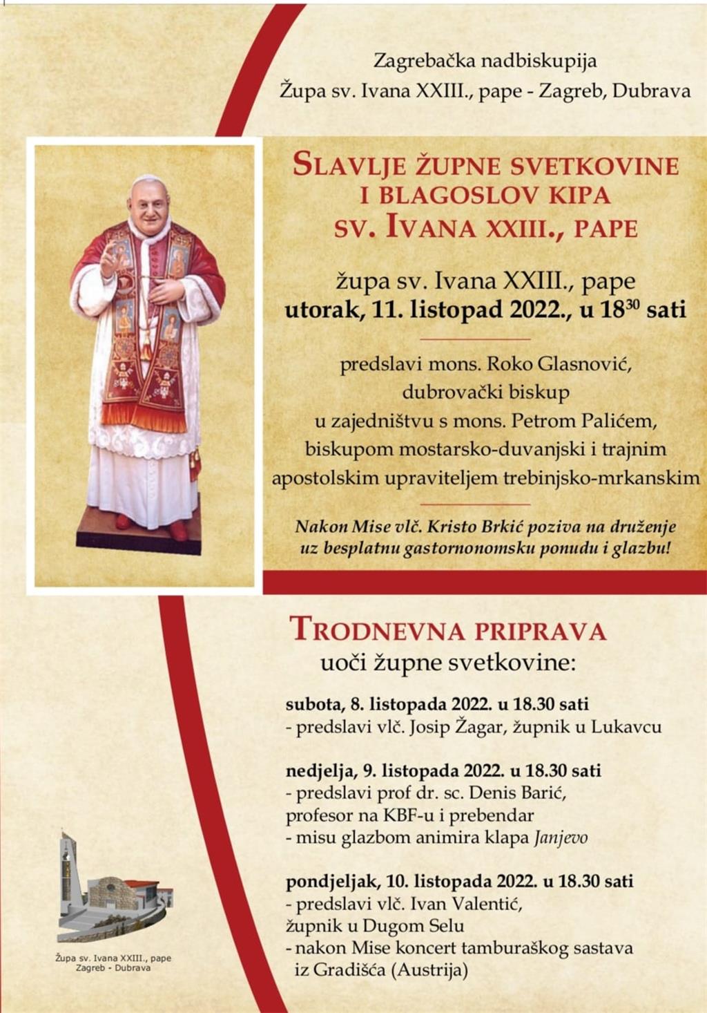 U utorak, 11. listopada 2022., na 60. obljetnicu otvorenja Drugog vatikanskog koncila, župa sv. Ivana XXIII., pape u zagrebačkoj Dubravi proslavit će svog sveca zaštitnika – sv. Ivana XXIII., papu.