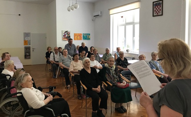 „Hvaljeno budi, sveto Trojstvo, hvalu svi dajmo Gospodu Bogu…“, odzvanjalo je privremenom kapelicom, koja se iz blagovaonice ubrzo nakon doručka pretvori u mjesto molitve, pjesme i susreta. Korisnici doma rado pjevaju jer ih svaka pjesma vrati u davne dane njihova života u raznim dijelovima grada Zagreba, a i raznih krajeva Lijepe naše. Ponekad nedostaje pojedinih riječi u stihovima pjesama, ali zato si svi daju oduška kod pjevanja refrena.