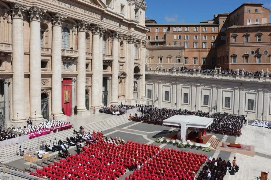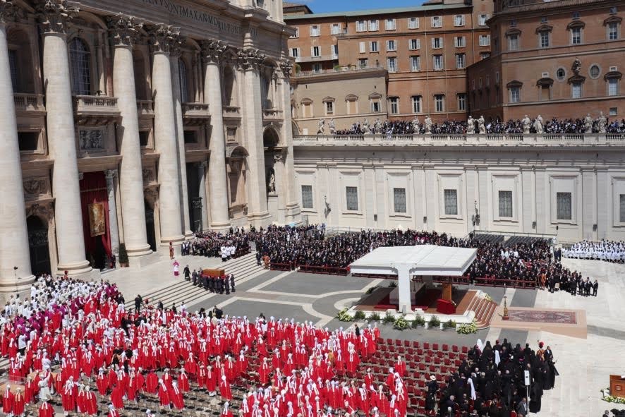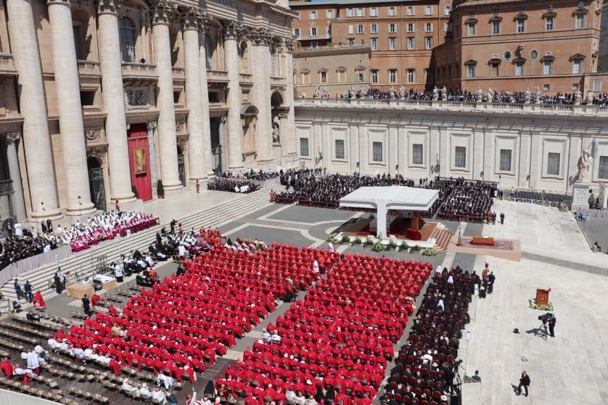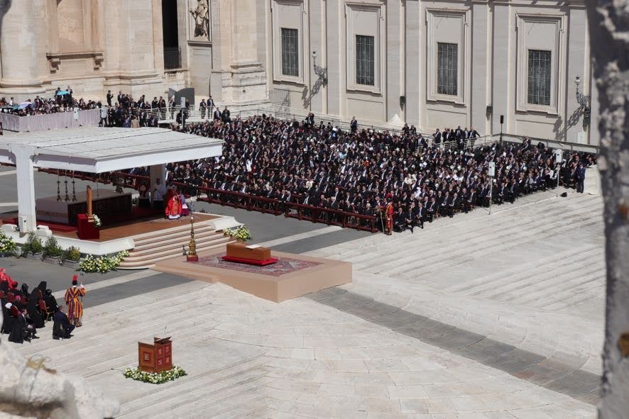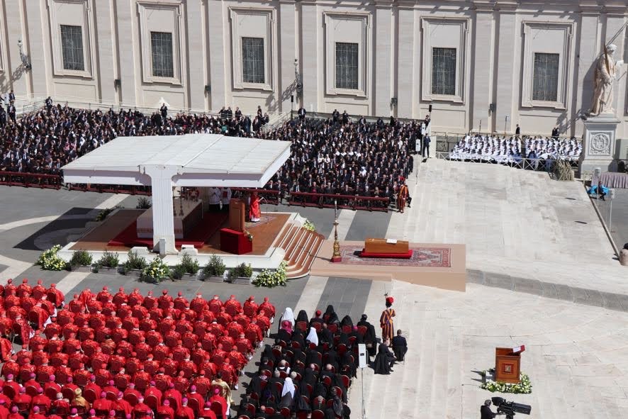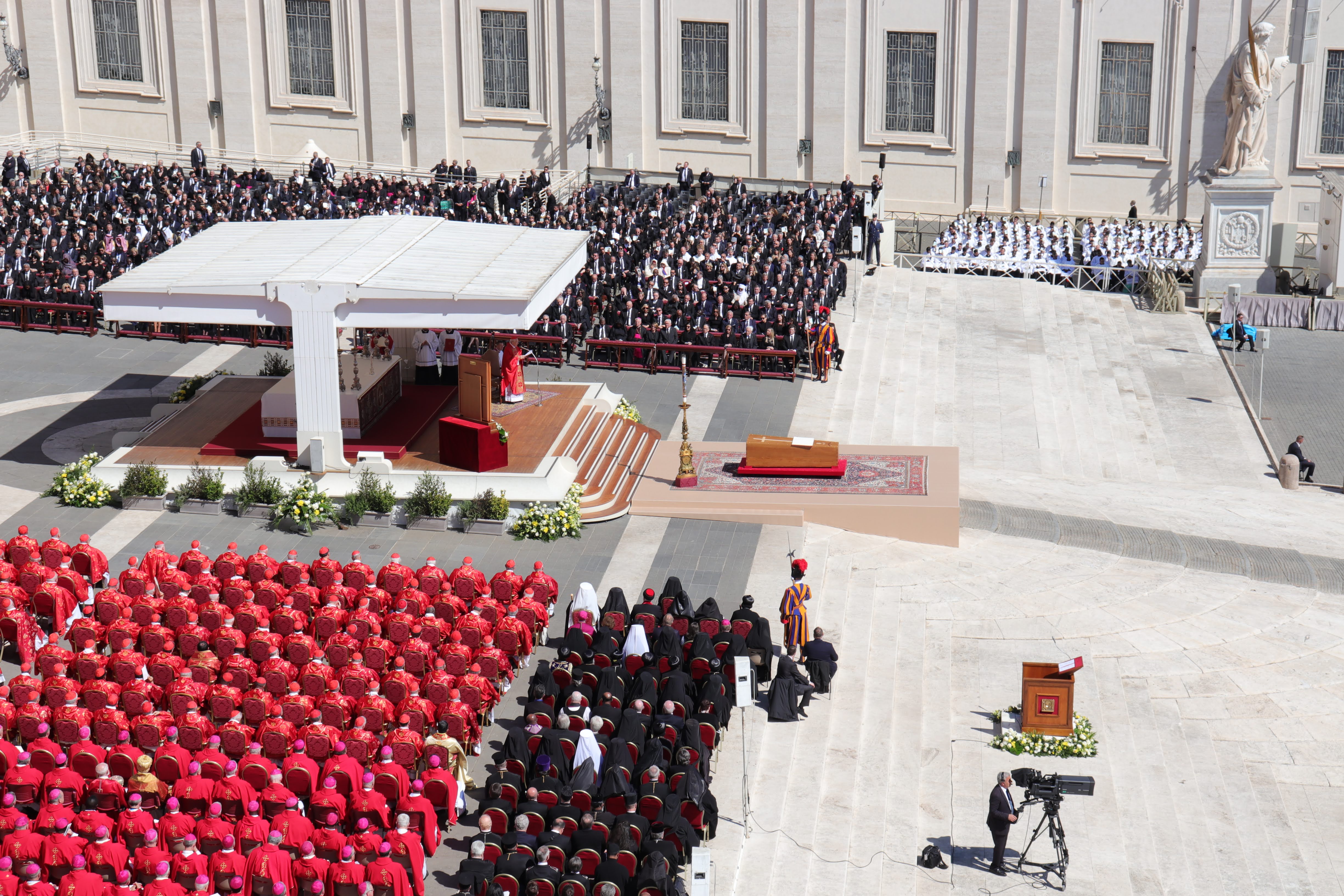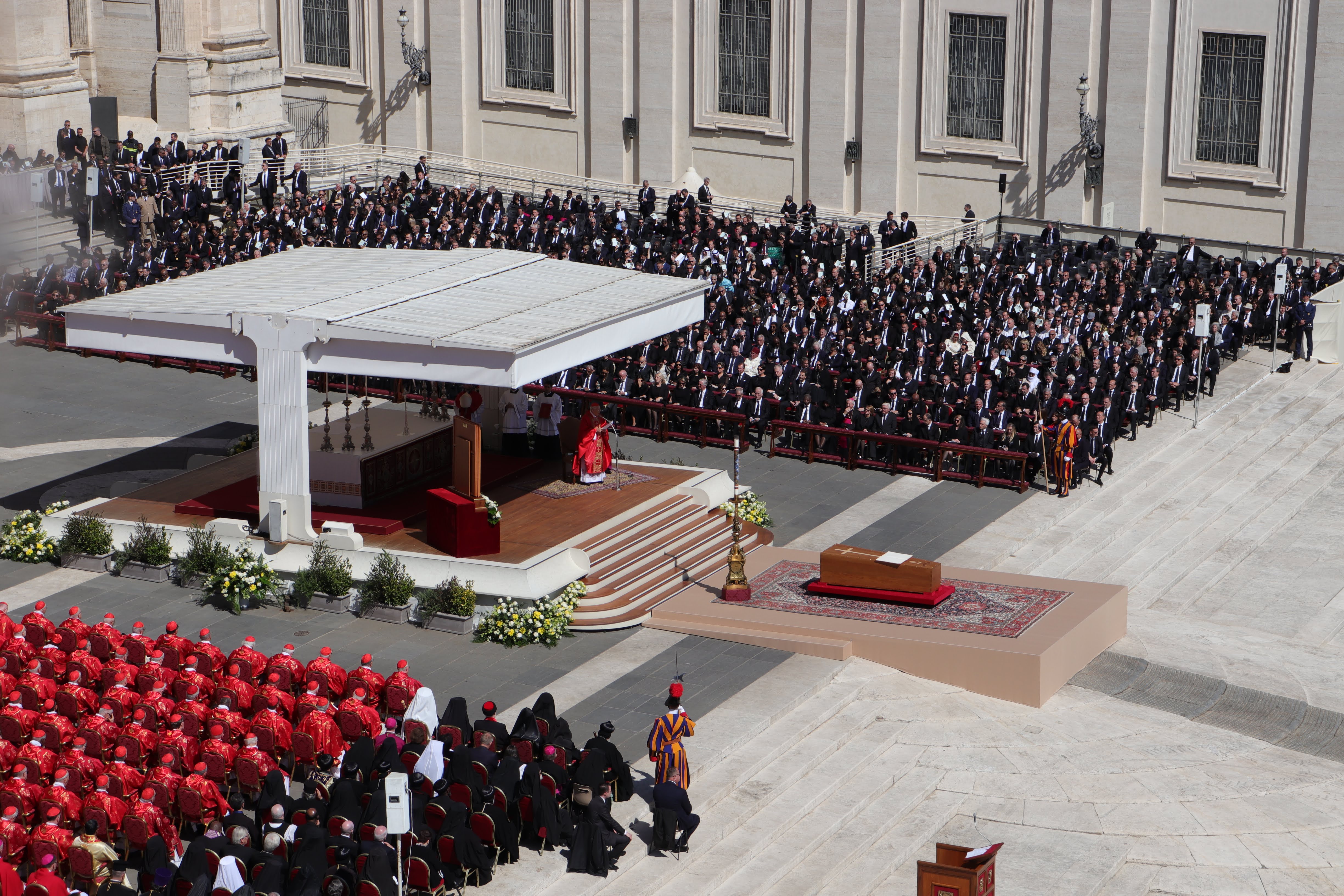 Dekan Kardinalskog zbora kardinal Giovanni Battista Re predvodio je sprovodnu misu za papu Franju u subotu 26. travnja na Trgu sv. Petra u Vatikanu. Kardinal Re u homiliji je istaknuo je kako je pontifikat Pape Franje bio obilježen dubokom bliskošću prema ljudima, posebice onima najpotrebnijima te njegovim neumornim zalaganjem za mir, milosrđe i dijalog među narodima.