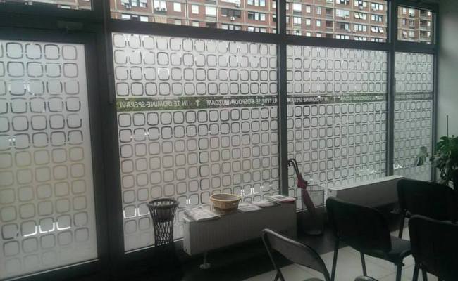 Ostakljena prozirna površina jedne strane Pastoralnog centra i kapelice sada je većim dijelom zatvorena dekorativnom zaštitnom folijom u koju je znalački uključeno Stepinčevo geslo na hrvatskom i latinskom jeziku: