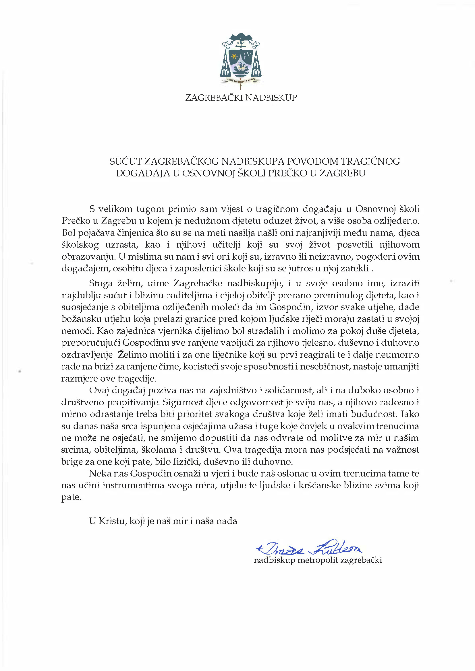 Stoga želim, uime Zagrebačke nadbiskupije, i u svoje osobno ime, izraziti najdublju sućut i blizinu roditeljima i cijeloj obitelji prerano preminulog djeteta, kao i suosjećanje s obiteljima ozlijeđenih moleći da im Gospodin, izvor svake utjehe, dade božansku utjehu koja prelazi granice pred kojom ljudske riječi moraju zastati u svojoj nemoći. Kao zajednica vjernika dijelimo bol stradalih i molimo za pokoj duše djeteta, preporučujući Gospodinu sve ranjene vapijući za njihovo tjelesno, duševno i duhovno ozdravljenje. Želimo moliti i za one liječnike koji su prvi reagirali te i dalje neumorno rade na brizi za ranjene čime, koristeći svoje sposobnosti i nesebičnost, nastoje umanjiti razmjere ove tragedije.
