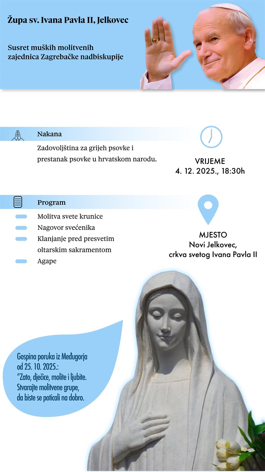 Susret muških molitvenih zajednica Zagrebačke nadbiskupije s nakanom zadovoljštvine za grijeh psovke i prestanak psovke u hrvatskom narodu održat će se u četvrtak 4. prosinca u Župi sv. Ivana Pavla II., pape u Jelkovcu, s početkom u 18.30 sati.