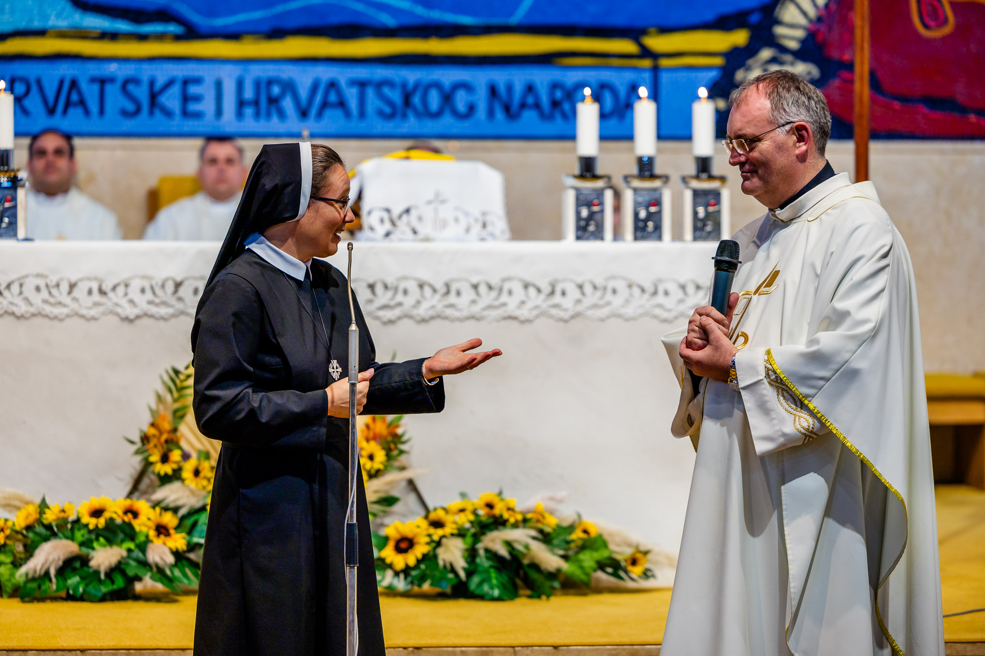 Na kraju misnog slavlja s. Ivana Margarin, sestra iz Družbe Kćeri Božje ljubavi sa službom nacionalne ravnateljice Papinskih misijskih djela, a vjernički odgajana upravo u ovoj župi. Govoreći o svom pozivu, odnosno odazivu u redovnički način života, s. Ivana kazala je da su ona "i prisutni svećenici mnoge iznenadili, ali i mnoge obradovali. Naša duhovna zvanja nisu bila nikakav grom iz vedra neba u našim osobnim životima. Mi smo s time rasli, s time smo se borili i hodili. Evo, velečasni Marko je išao u sjemenište nakon osnovne škole, dok smo velečasni Matija i ja išli nakon srednje, odnosno Matija već nakon dvije godine bogoslovije. Dakle, bio je to jedan hod, odrastanje gdje smo ponekad i uzmicali pred samim pozivom, nekada bili puni entuzijazma, ali doista mogu reći da je to bio jedan proces koji je u nama zrio, ali bio hranjen primjerom mons. Radanovića i sestara Kćeri Božje ljubavi koje su i danas u ovom svetištu i u ovoj župi. Promatrajući njihove primjere, živeći u ovoj župnoj zajednici koja je uvijek imala obiteljski duh kojeg je mons.Radanović vrlo njegovao, ovdje smo se doista svi osjećali kao kod kuće. Sestre su nas uključivale u sve najobičnije stvari, od plijevljenja trave između kocki u stazama oko crkve, do brisanja prašine, sudjelovanja u zboru, pakiranja Glasnika svetog Josipa. Dakle, što god se u župi događalo, svi smo bili ovdje i koliko god smo bili maleni, našao se neki razlog, samo da budemo ovdje. Mislim da je to odigralo ključnu ulogu u našem duhovnom pozivu jer smo doživljavali ovu župu, crkvu, mjestom gdje se osjećamo doma, gdje se osjećamo svojima i na kraju kao onu koju želimo potpuno služiti. Na tom putu svatko od nas nosio se i s osobnim poteškoćama, borbama, različitim prihvaćanjima okoline. Ipak, u molitvi, a osobito u molitvi mons. Radanovića i sestara, ali i ove župne zajednice osjećali smo se nošeni kao što se osjećamo i dan danas", rekla je s. Margarin.