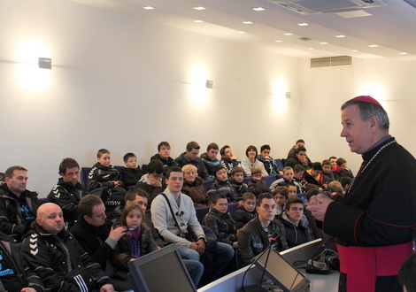 Pozdravljajući okupljene mlade rukometaše i prisutne iz vodstva klubova, biskup Gorski je istaknuo potrebu mladih za molitvom i ustrajnošću, jer molitva je ta koja daje snagu kako za športski život tako i za svakodnevne životne obveze. Mladim rukometašima kao uspomenu i poticaj na molitvu, biskup Gorski darovao je krunice.