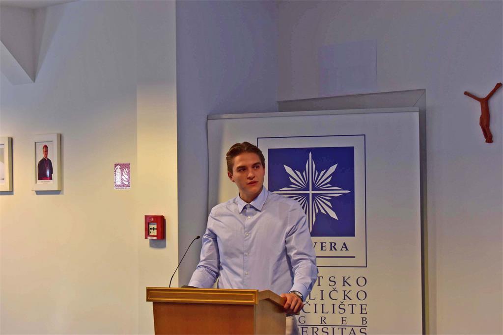 U ime nagrađenih studenata obratio se Pero Josip Maslać zahvalio profesorima i Odjelu što su prepoznali njihov rad, a sve studente, poglavito brucoše, pozvao je da se uključe u aktivnosti Sveučilišta na bilo koji način, makar sa savjetom ili orijentirom „izgubljenima“ u prostorima Sveučilišta, da se povežu sa svim kolegama i s drugih studija, da uživaju u studiranju na svim mogućim razinama i da od studentskog doba stvore iskustvo koje će pamtiti cijeli život.