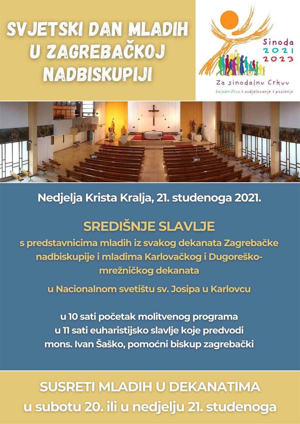 Na svetkovinu Krista Kralja, u nedjelju 21. studenoga 2021., Svjetski dan mladih obilježit će se u Zagrebačkoj nadbiskupiji. Proslava Svjetskog dana mladih održat će se po dekanatima naše Nadbiskupije u subotu 20. ili u nedjelju 21. studenoga, dok će središnje slavlje, na kojem će sudjelovati predstavnici mladih iz svih dekanata te mladi Karlovačkog i Dugoreško-mrežničkog dekanata, biti u Nacionalnom svetištu sv. Josipa u Karlovcu.