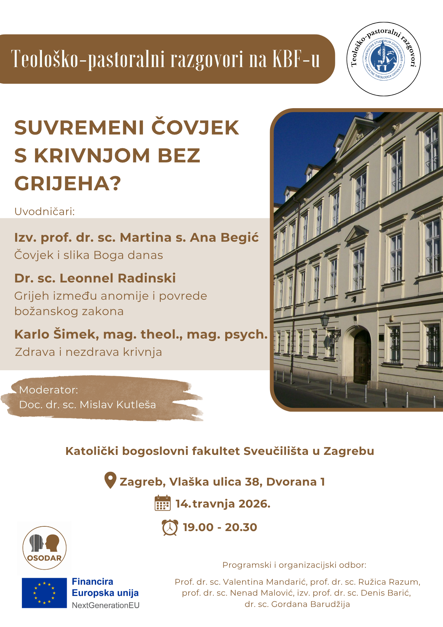 Teološko-pastoralni razgovori "Suvremeni čovjek s krivnjom bez grijeha?" održat će se u utorak 14. travnja s početkom u 19 sati u prostorijama Katoličkoga bogoslovnog fakulteta Sveučilišta u Zagrebu.
