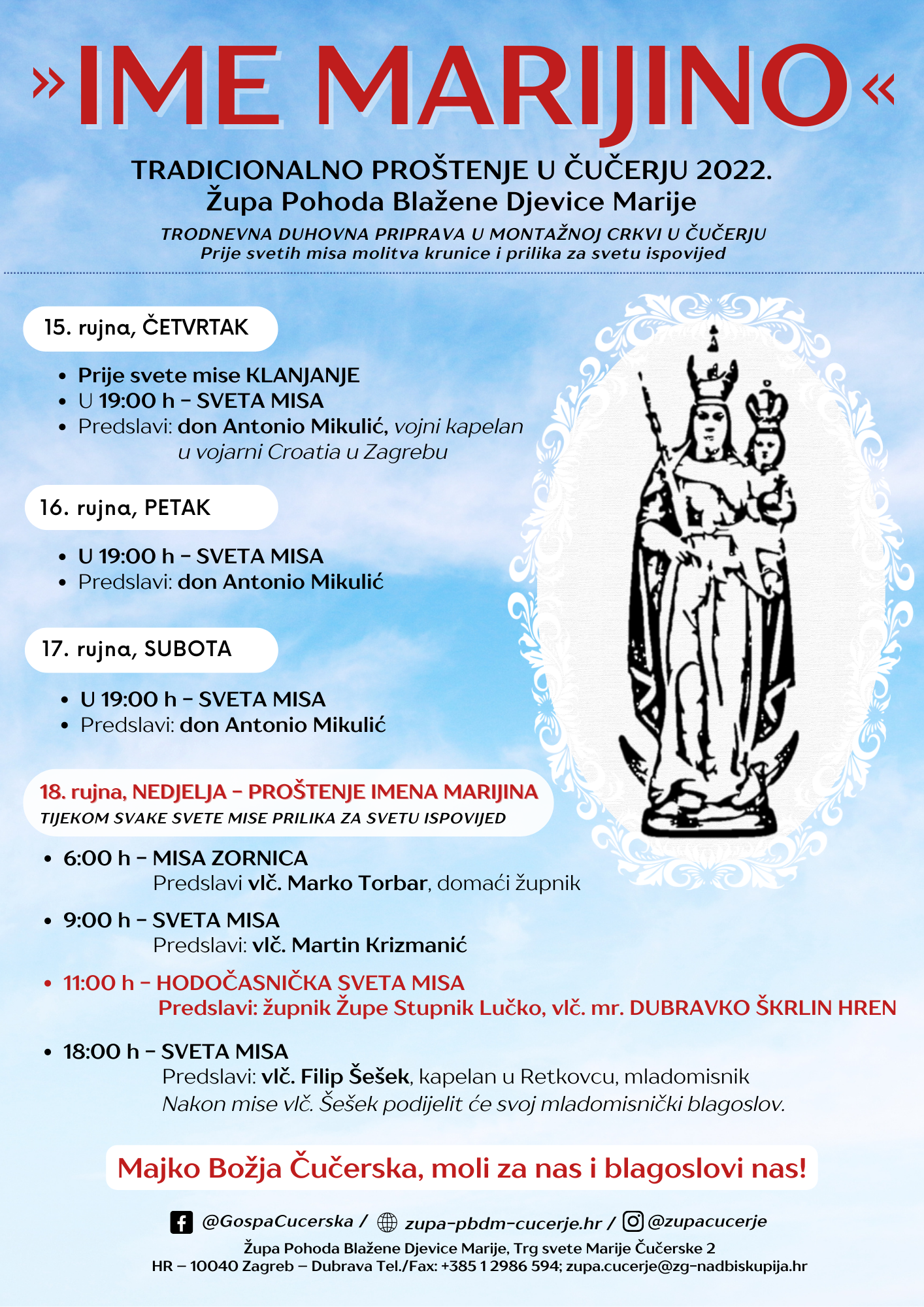 U nedjelju 18. rujna, na dan proštenja Imena Marijina, svetu misu zornicu u 6 sati predslavit će domaći župnik vlč. Marko Torbar, u 9 sati vlč. Martin Krizmanić, dok će hodočasničku svetu misu u 11 sati predslaviti vlč. mr. Dubravko Škrlin Hren, župnik Župe Stupnik Lučko.