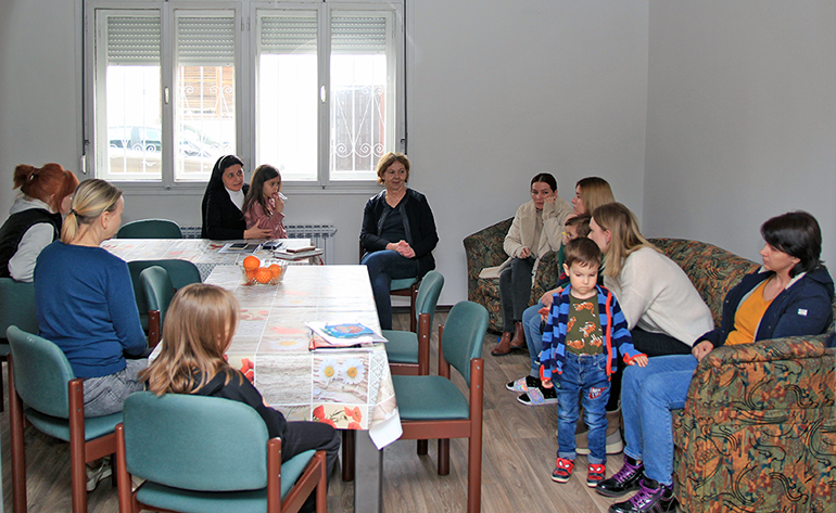 I ovu grupu raseljenih osoba dočekale su ravnateljica Caritasa s. Jelena Lončar i voditeljica socijalne službe Jadranka Bosnar. S. Jelena je svima srdačno izrazila dobrodošlicu i zaželjela ugodan boravak, a posebice djeci.