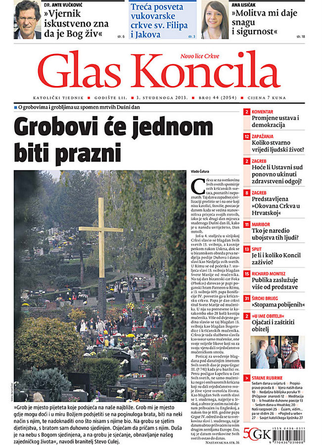 "Grobovi će jednom biti prazni" naslovna je tema ovotjednoga broja Glasa Koncila, s nadnevkom 3. studenoga, u kojoj novinar Vlado Čutura piše o grobovima i grobljima uz svetkovinu Svih svetih i Dušni dan.