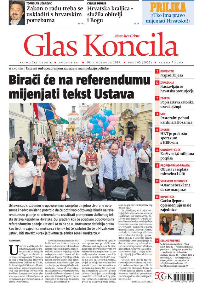 „Ustavni sud upozorenjem zaustavio manipulaciju politike“ - stoji na naslovnici novoga broja Glasa Koncila od 10. studenoga. Službenim je upozorenjem Ustavni sud razriješio umjetno stvorene nejasnoće i nedvosmisleno potvrdio da će pozitivno očitovanje birača na referendumsko pitanje na referendumu rezultirati promjenom službenog teksta Ustava Republike Hrvatske.