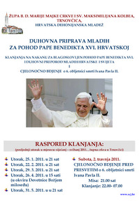 U župi B. D. Marije Majke Crkve i sv. Maksimilijana Kolbea u zagrebačkoj Trnovčici, od siječnja do svibnja 2011., održat će se Duhovna priprava mladih za pohod pape Benedikta XVI. Hrvatskoj.