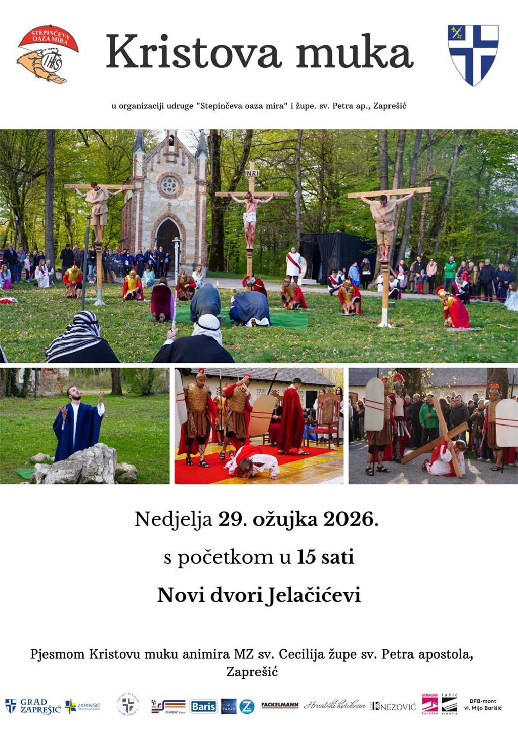 Udruga "Stepinčeva oaza mira" u suradnji sa Župom sv. Petra, Zaprešić, organizira uprizorenje Kristove Muke koje će se održati na Nedjelju Muke Gospodnje, 29. ožujka, u perivoju Novih dvora u Zaprešiću s početkom u 15 sati.