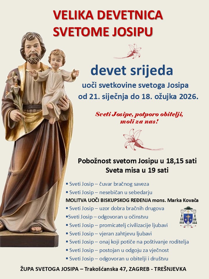 Župa svetog Josipa na zagrebačkoj Trešnjevki priprema se za proslavu svog nebeskog zaštitnika velikom devetnicom koja započinje u srijedu 20. siječnja, a traje do srijede 18. ožujka. Tijekom devet srijeda vjernici će se pripremati za svetkovinu sv. Josipa pobožnošću krunice i litanija sv. Josipu u 18.15 sati te svetom misom u 19 sati.
