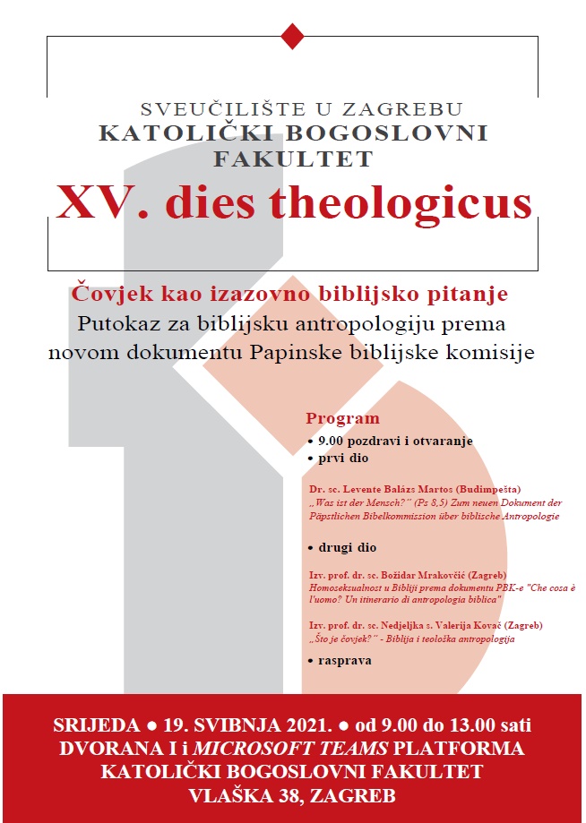 U organizaciji Katoličkoga bogoslovnog fakulteta Sveučilišta u Zagrebu u srijedu, 19. svibnja 2021. godine, s početkom u 9.00 sati u dvorani I. (014) Fakulteta, održat će se XV. Dies theologicus naslovljen „Čovjek kao izazovno biblijsko pitanje. Putokaz za biblijsku antropologiju prema novom dokumentu Papinske biblijske komisije“.