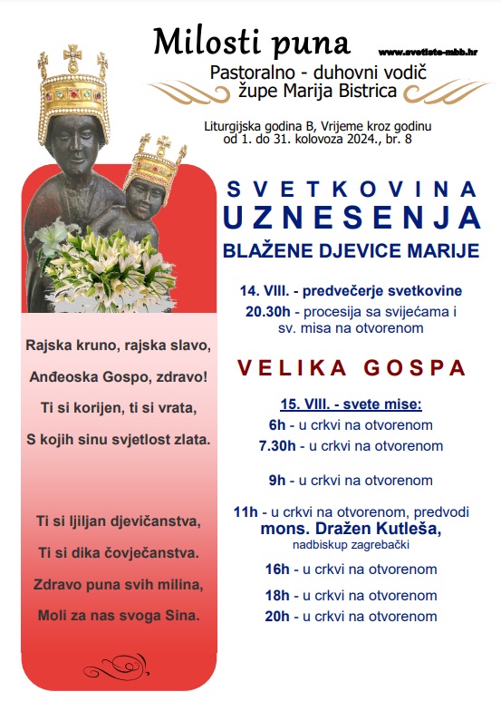 Središnje misno slavlje svetkovine Uznesenja BDM - Velike Gospe u Nacionalnom svetištu Majke Božje Bistričke u četvrtak, 15. kolovoza u 11 sati predvodit će zagrebački nadbiskup mons. Dražen Kutleša u crkvi na otovrenom. Istoga dana, misna slavlja slavit će se u 6, 7.30, 9, 16, 18 i 20 sati.