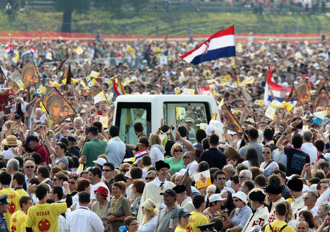 Započeo je središnji događaj pohoda pape Benedikta XVI. Hrvatskoj, velebna misa na hipodromu, u prigodi proslave Prvog susreta hrvatskih katoličkih obitelji. Papa je na hipodrom došao u papamobilu, a radosno ga je pozdravljalo oko 400.000 vjernika, mašući vatikanskim i hrvatskim zastavama. Uz Papu koncelebrira sedamdesetak biskupa iz Hrvatske i inozemstva i više od tisuću svećenika.