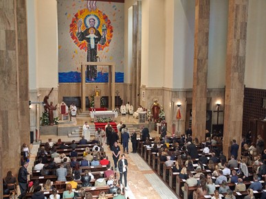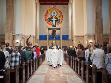 Misno slavlje u crkvi svetog Antuna Padovanskog na Svetom Duhu, kojem su prisustvovali prorektori, pročelnici, profesori, djelatnici i studenti Hrvatskog katoličkog sveučilišta, predvodio je mons. Ivan Šaško, izaslanik zagrebačkog nadbiskupa mons. Dražena Kutleše, pomoćni biskup zagrebački i prvi rektor HKS-a, u koncelebraciji s rektorom Hrvatskog katoličkog sveučilišta prof. dr. sc. Željkom Tanjićem, doc. dr. sc. Krunoslavom Novakom, generalnim tajnikom Hrvatske biskupske konferencije, prof. dr. sc. Antom Crnčevićem, prorektorom za kvalitetu, identitet i poslanje Sveučilišta, vlč. Branimirom Jagodićem, sveučilišnim kapelanom, vlč. Filipom Šešekom, povjerenikom Zagrebačke nadbiskupije za mlade, pastoral sportaša i koordinatorom dušobrižništva za studente u Zagrebu, fra Filipom Pušićem, prof. dr. sc. Jerkom Valkovićem sa Sveučilišnog odjela za komunikologiju te doc. dr. sc. Odilonom Singboom s Katedre za teologiju.