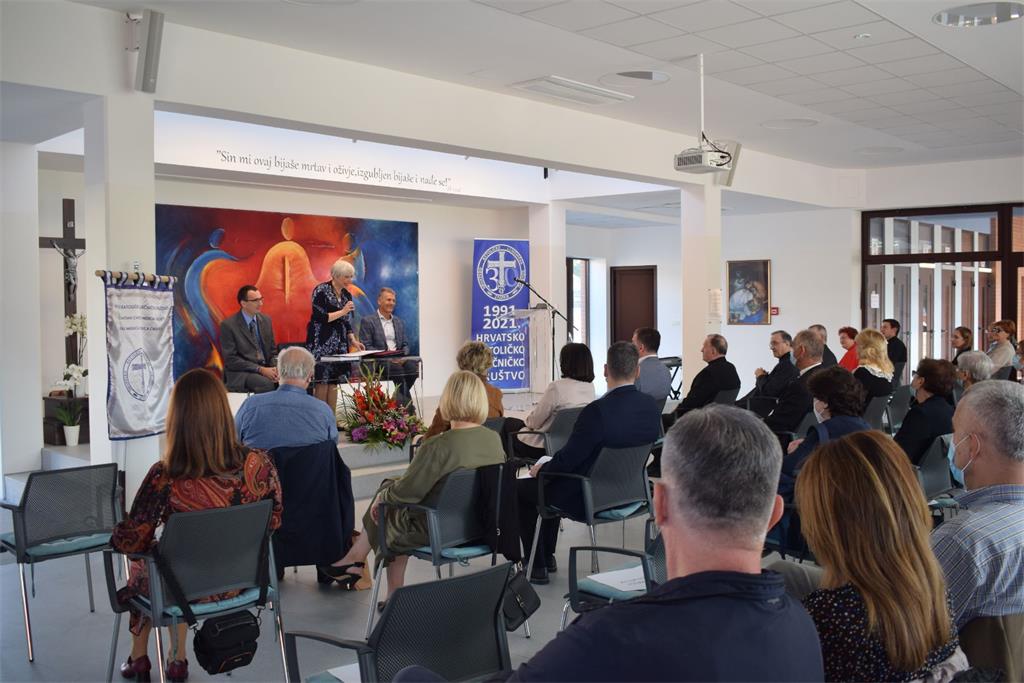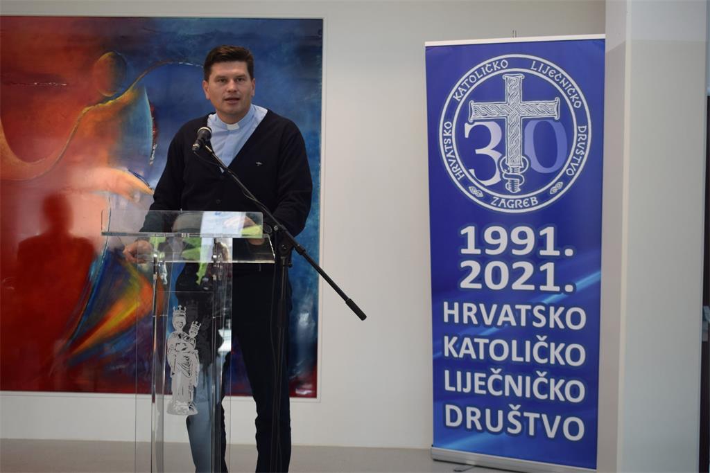 izlaganje predsjednika Društva doc. dr. sc. prim. Roka Čivljaka koji je u prvom redu zahvalio na dolasku predstavnicima brojnih podružnica te gostima među kojima su bili prvi duhovnik Društva mons. dr. Valentin Pozaić, pomoćni biskup zagrebački u miru, kancelar Zagrebačke nadbiskupije prof. dr. Stjepan Večković, rektor Hrvatskog nacionalnog svetišta Majke Božje Bistričke preč. Domagoj Matošević, predsjednica Hrvatskoga katoličkog društva medicinskih sestara i tehničara s. Slavica Janković.
