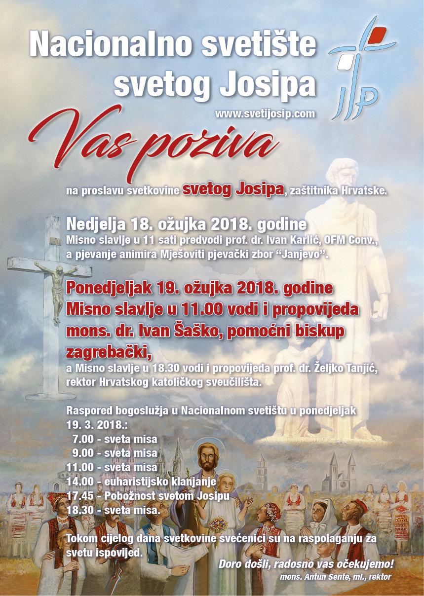 Tog dana svečano euharistijsko slavlje u Nacionalnom svetištu svetog Josipa u Karlovcu, s početkom u 11 sati predvodit će mons. lvan Šaško, pomoćni biskup i generalni vikar, a u 18.30 sati prof. dr. sc. Željko Tanjić, rektor Hrvatskog katoličkog sveučilišta.