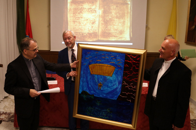 Nakon izlaganja, u ime sudionika kolokvija, kapetan i umjetnik Stjepko Mamić darovao je Zavodu sliku s motivom „Letećega čovjeka“ (homo volans) iz Vrančićeva djela „Machinae novae“.