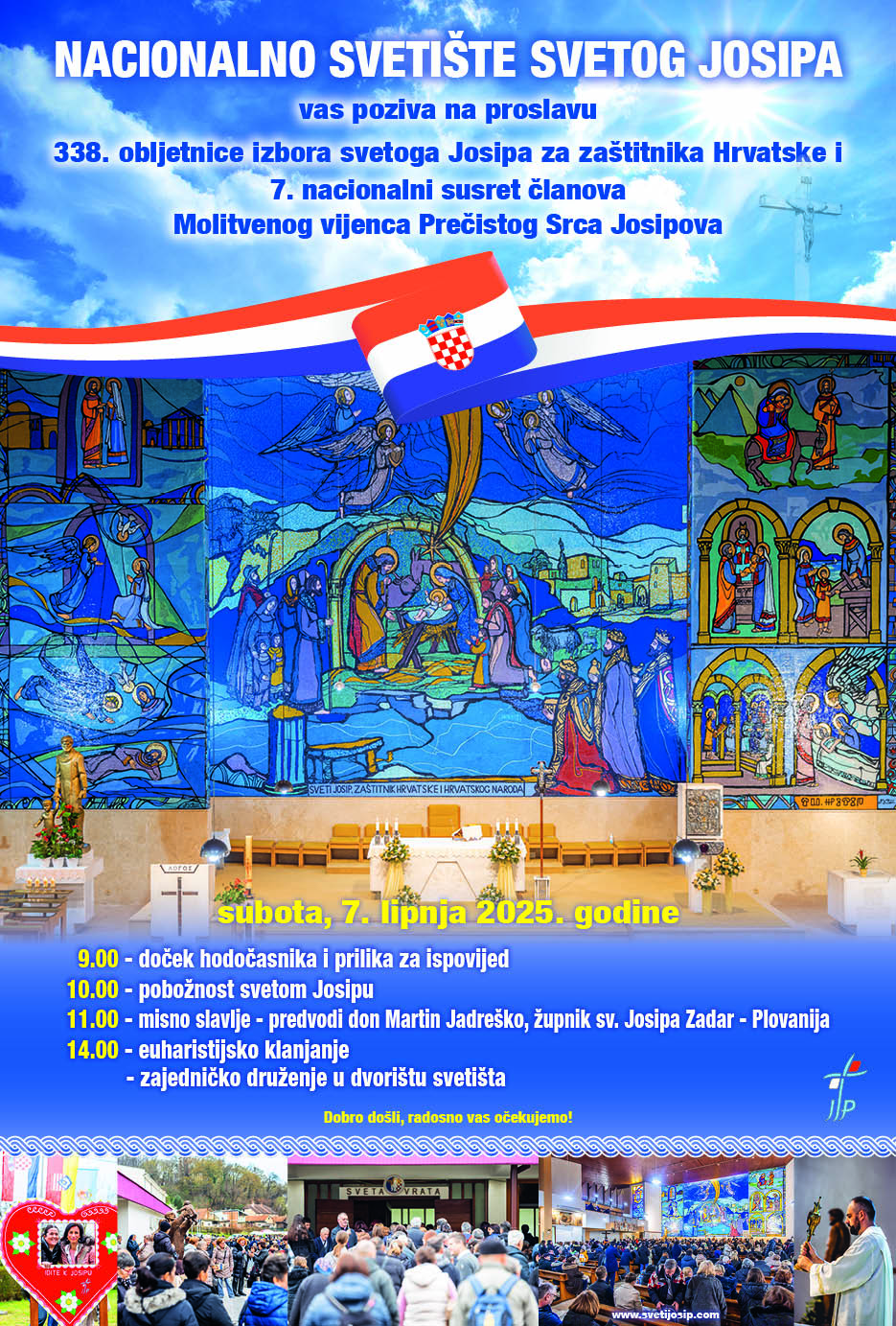 U Nacionalnom svetištu svetog Josipa obilježit će se 338. obljetnica izbora svetoga Josipa za zaštitnika Hrvatske i sedmi nacionalni susret članova Molitvenog vijenca Prečistog Srca Josipova, svečanim misnim slavljem u subotu 7. lipnja 2025. Svetu misu će predvoditi don Martin Jadreško, župnik Župe sv. Josipa, Zadar - Plovanija.