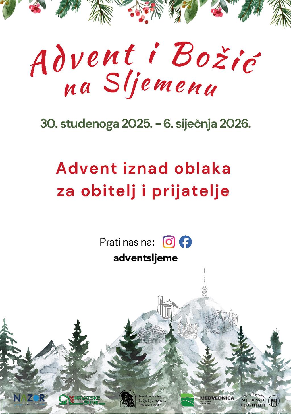 Advent i Božić na Sljemenu ponovno donose bogat duhovni, kulturni i obiteljski vikend-program u organizaciji isusovačke Župe Majke Božje Sljemenske Kraljice Hrvata, u suradnji s Hrvatskim šumama - Šumarija Zagreb, Zagrebačkim Holdingom - TA Snježna Kraljica i hotelom Tomislavov dom, Parkom prirode Medvednica te sljemenskim ugostiteljima.