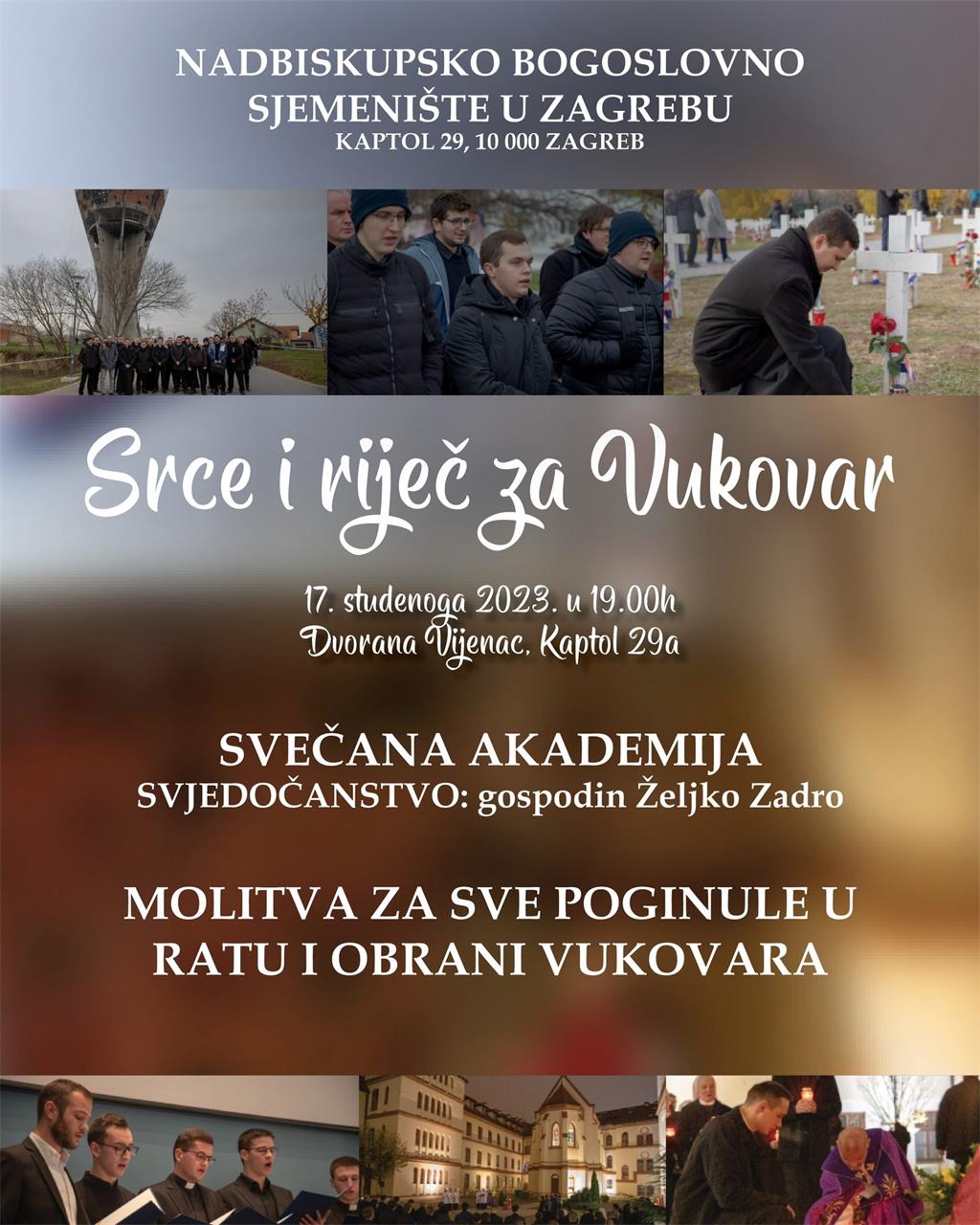 Obilježavajući spomen na sve žrtve Vukovara i Domovinskog rata, Nadbiskupsko bogoslovno sjemenište u Zagrebu poziva vas na tradicionalnu svečanu akademiju "Srce i riječ za Vukovar" koja će se održati u petak 17. studenoga 2023. s početkom u 19 sati u dvorani "Vijenac" Nadbiskupskog pastoralnog instituta (Kaptol 29a).