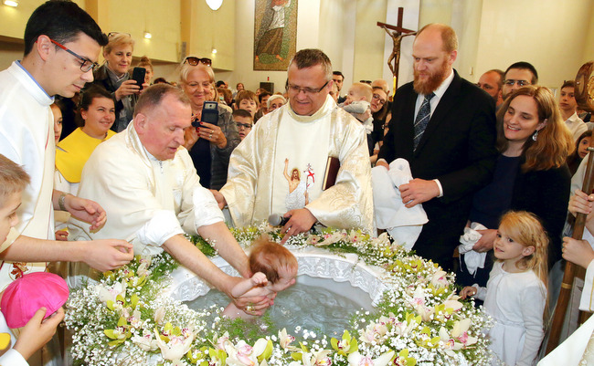 Na sveopće oduševljenje vjernika, obred krštenja vršio se uranjanjem cijelog krštenika u vodu. Ovaj svečani čin biskup Pozaić izveo je vrlo stručno i sigurne ruke. Na kraju euharistijskog slavlja svim prisutnima obratio se Domagoj Medić, otac novokrštenoga Tadeja Višeslava, zahvalivši se prvo dragom Bogu, ali i ocu biskupu te prisutnim svećenicima. „Mogu svjedočiti što su apostoli rekli, mi smo tomu svjedoci. Ja mogu reći da smo moja supruga i ja tomu svjedoci da Krist uskrišava svaki dan u našem životu, sa svim problemima sa djecom. Sve vas molim da molite za nas da kad se vratimo u Galileju, možemo i tamo vidjeti Isusa, tamo gdje su najveći problemi sa djecom i sa svime.“, rekao je Domagoj i pozvao cijelu župnu zajednicu na agape da zajedno proslave ovaj radosni dan.