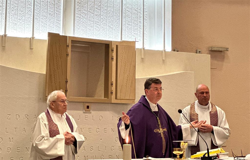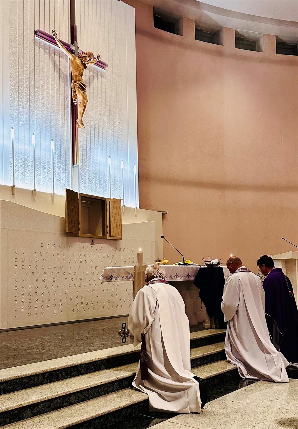 U svojoj homiliji okupljenim vjernicima biskup Šaško progovorio je o povezanosti triju temeljnih i neodvojivih sastavnica - oltara, svetohraništa i raspela: "Draga braćo i sestre, gledajući ovako uređen oltarni prostor razvidne su tri temeljne i neodvojive sastavnice: oltar, svetohranište i raspelo; one se mogu čitati i obrnutim redoslijedom: raspelo, svetohranište, oltar. Svetohranište je stavljeno između Kristove žrtve na križu i oltara; između, s jedne strane, otajstva oduzimanja Zaručnika, otvaranja praznine, odsutnosti s kojom se ljubav ne miri, i – s druge strane – stola Posljednje večere, zajedništva, vječnosti. Na tu os stane cijeli život čovjeka, ali i sav život svijeta."