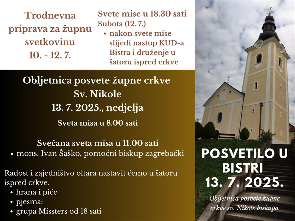 Župa sv. Nikole biskupa u Bistri svečanim misnim slavljem proslavit će obljetnicu posvete župne crkve u nedjelju 13. srpnja 2025. Misu u 11 sati predvodit će zagrebački pomoćni biskup mons. Ivan Šaško.