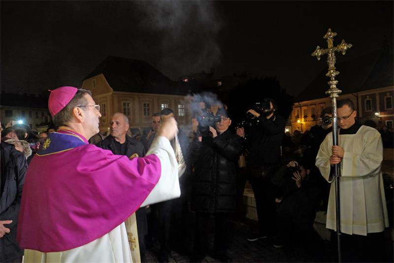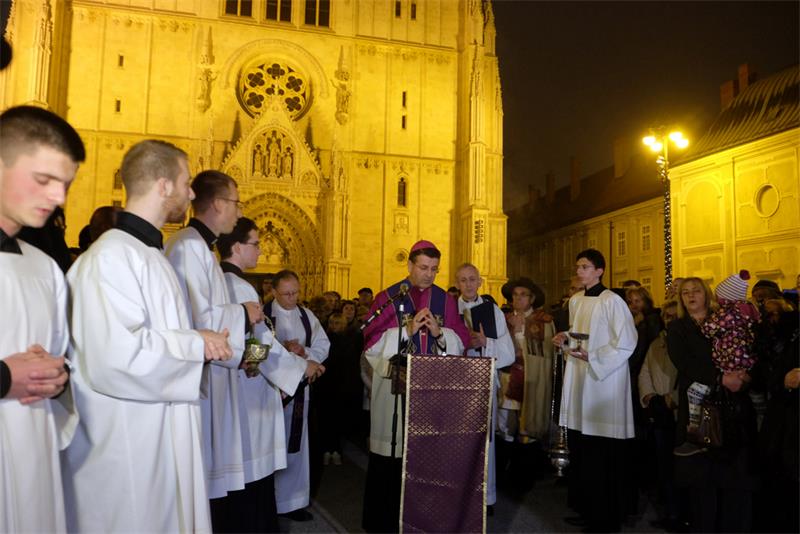 Stoga, naglasio je biskup Šaško „ovaj trg pred katedralom bit će pokazatelj kršćanskoga pripremanja za Božić, postupnoga kićenja i hod prema punini“ i zato „molimo za milost obraćenja, za Božju blizinu u obiteljima, za sve siromašne i tužne, za sve koji trpe ili gube nadu. Ovdje pred kipom Bezgrješne molimo Marijinu poniznost, njezinu otvorenost Bogu i poslušnost Božjoj volji, kako ne bi bio samo 'Advent u Zagrebu', nego da bi i Zagreb bio u adventu, u budnosti za dar i za dobro. Palimo svijeću, simbol svjetla vjere, nade i ljubavi u našemu životu; simbol darivanja i zahvalnosti za razne Božje darove, među kojima naročito za bližnje. Ovo je vrijeme osjetljivosti i pronalaženja nove snage na izvoru s kojega je potekao život, na vrelu našega postojanja i krsnoga preporoda. Zato se na početku spominjemo svoga krštenja i znamenujemo znakom križa poškropljeni blagoslovljenom vodom.“