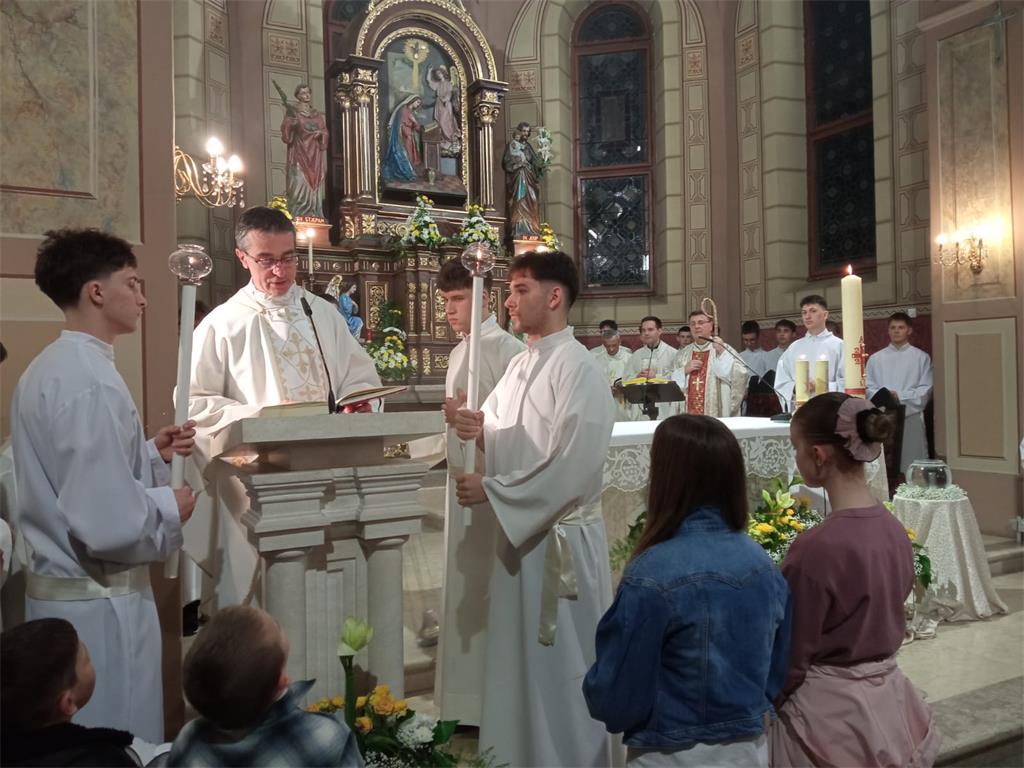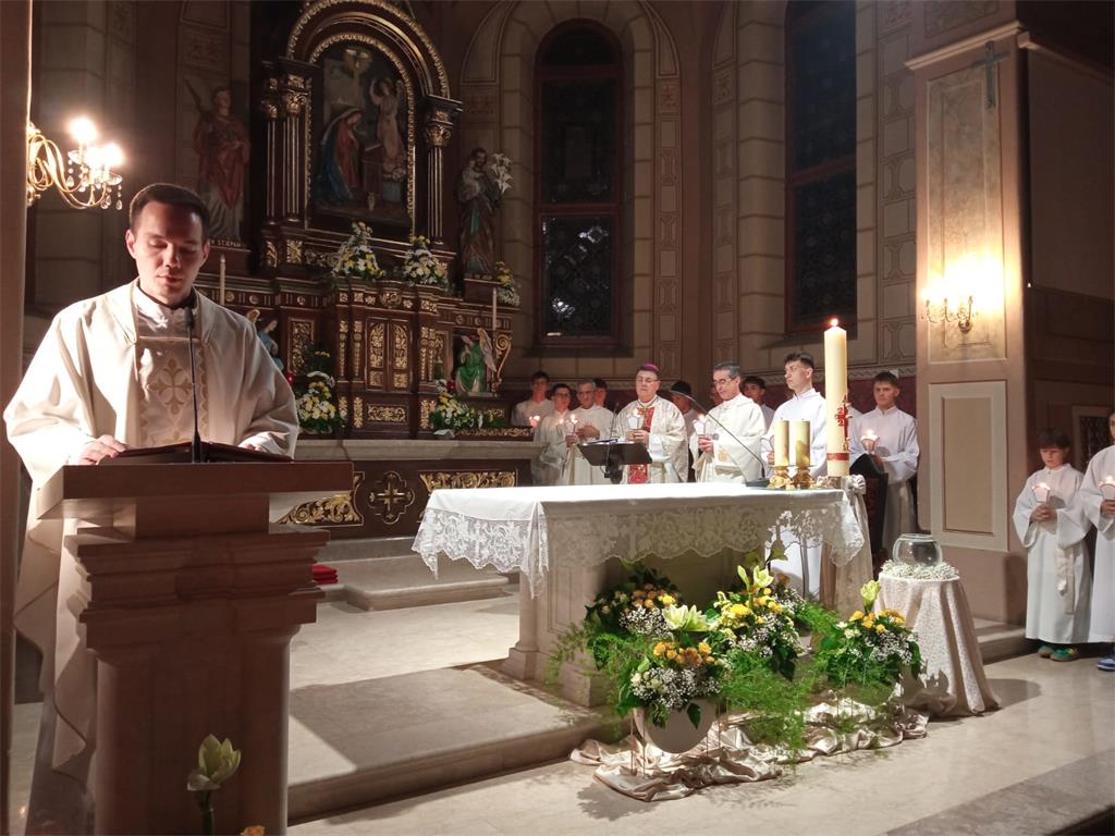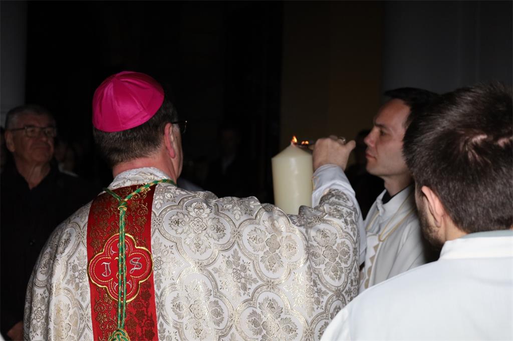 Večeras započinje prvi dan, sasvim nova stvarnost; novi dan koji ne može zastarjeti; dan iznenađujuće snage i divljenja, rekao je biskup Šaško naglasivši kako ova noć pokreće novi tjedan, novo razdoblje, novi svijet. "Mi započinjemo s Bogom; On nam daje život; i samo uz njegov blagoslov želimo započeti svoja razmišljanja, svoj govor i svoje odnose s drugima i svoj rad. Zato su naši stari sva svoja djela, susrete, blagovanja započinjali znakom križa, ne srameći se započinjati i završavati s Bogom. I to su nam prenijeli, predali kao snagu i smjerokaz. Kada su se susretali, spominjali su Isusovo i Marijino ime; u pozdravu: Hvaljen Isus i Marija nalazi se skraćeni hvalospjev. I kada su se opraštali izgovarali su 'zbogom', u kojemu je sadržana molitva da ljudi trajno budu s Božjom prisutnošću. Ovo večerašnje slavlje polazište je za naše prenošenje dragocjenoga blaga života jednih drugima, osobito djeci. I ohrabrenje da se ne ustručavamo pokazati tko je za nas Početak i Završetak, kako je ispisano na uskrsnoj svijeći; što je naša čežnja i naša radost tijekom svih dana u godini, pod znakom proslavljenoga križa i Kristova svjetla. Kamen je otkotrljan, anđeo sjedi na njemu: materijalni svijet nije više mjerodavan. Više nije važno što imamo, što posjedujemo ili koliko vrijedimo za prolazni svijet; važno je samo tko smo i komu živimo. Ova je večer ljepota posljednjih koji postaju prvi; najmanjih koji su najveći; uskrsna Radosna vijest objavljuje da su ljudi koji se ne nameću i koji su prezreni Božja voljena i blagoslovljena djeca. Nedjelja koja izrasta iz Kristova vazma otvorenost je budućnosti. Svanut će jutro, započeti novi dan i novi tjedan, ali i novi život. Njega slavimo, kao Božji dar. Prepoznajmo to nakon ove noći, dok molimo da nas zahvati ljepota Uskrsa, jer iznova je otvoren novi svijet; nebo je među nama i u nama!", zaključio je homiliju biskup Šaško.