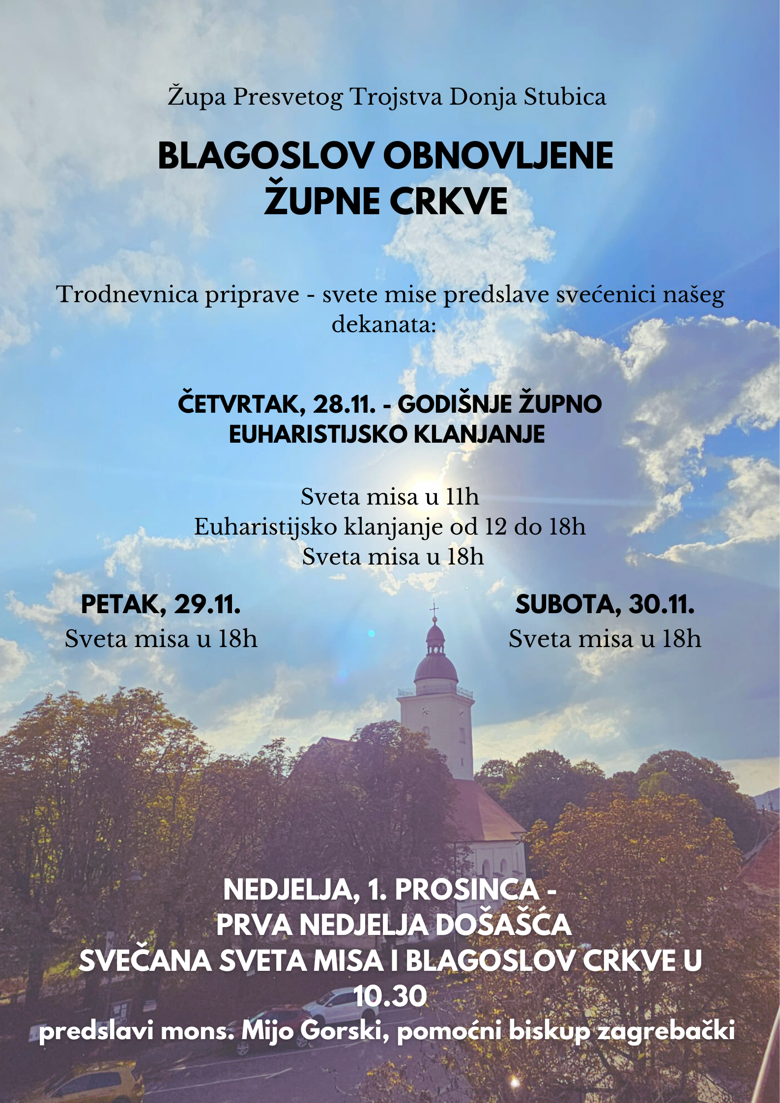 U nedjelju 1. prosinca u 10.30 sati pomoćni biskup zagrebački mons. Mijo Gorski predslavit će svečanu svetu misu u obnovljenoj župnoj crkvi župe Presvetog Trojstva u Donjoj Stubici kada će ujedno biti i blagoslov obnovljene crkve.