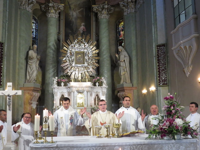 Rumunjski, njemački, madžarski i hrvatski hodočasnici na svojim su jezicima slušali misna čitanja, pjevali svoje popijevke te slušali homiliju. Na završetku misnoga slavlja mjesni biskup Roos predao je kardinalu Bozaniću medalju svetišta a kardinal je darovao mons. Roosu medalju sv. Ivana Pavla II. te zahvalivši biskupu Roosu na pozivu, istaknuo da je na misnome slavlju osjetio katoličko zajdništvo koje povezuje sve narode.