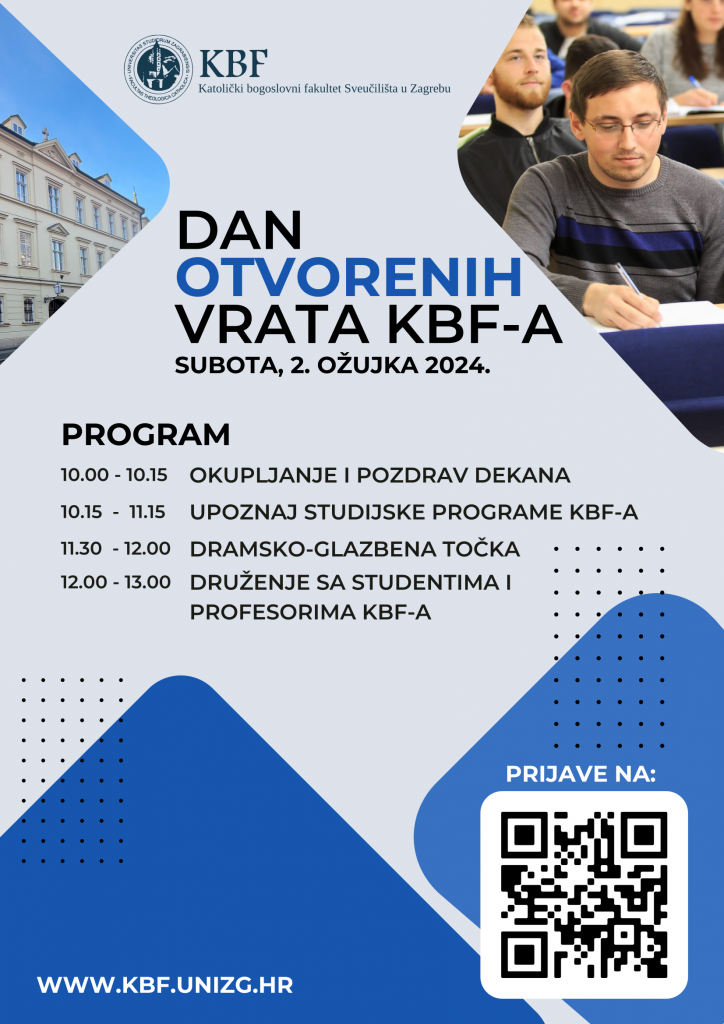 Dan otvorenih vrata Katoličkoga bogoslovnog fakulteta Sveučilišta u Zagrebu bit će održan u subotu 2. ožujka 2024. s početkom u 10 sati u prostorijama fakulteta, u Vlaškoj ulici 38.