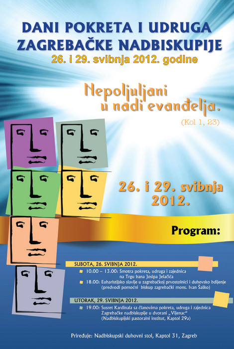 Dani pokreta i udruga Zagrebačke nadbiskupije održat će se 26. i 29. svibnja ove godine pod geslom „Nepoljuljani u nadi evanđelja“ (Kol 1,23).