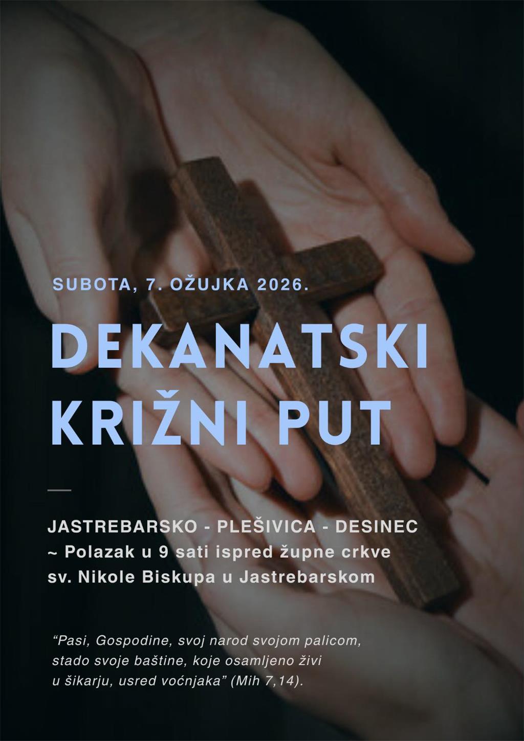 Dekanatski križni put Jastrebarskog dekanata održat će se u subotu 7. ožujka 2026. Okupljanje i početak križnog puta bit će u 9 sati u župnoj crkvi sv. Nikole biskupa u Jastrebarskom. Zatim ruta ide preko Župe Plešivica do župne crkve sv. Ivana Krstitelja u Desincu gdje će se slaviti sveta misa.