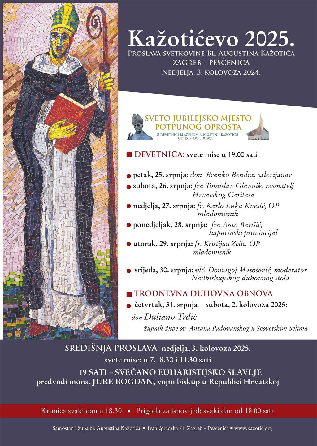 U petak 25. srpnja, na blagdan sv. Jakova apostola, započinje devetodnevna priprava za proslavu zaštitnika samostana i Župe bl. Augustina Kažotića u Zagrebu na Peščenici. Mise su svakim danom u 19 sati.