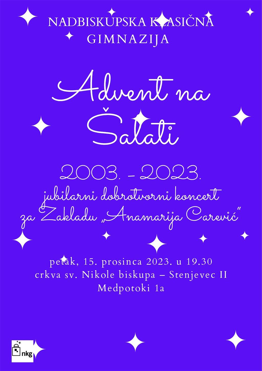 Dvadeseti dobrotvorni koncert „Advent na Šalati“ održat će se u petak, 15. prosinca 2023. u crkvi sv. Nikole u zagrebačkoj četvrti Stenjevec (Medpotoki 1a) u 19:30. Dobrovoljni prilozi darovat će se zakladi „Anamarija Carević“. Anamarija Carević bila je učenica Nadbiskupske klasične gimnazije u Zagrebu na Šalati.