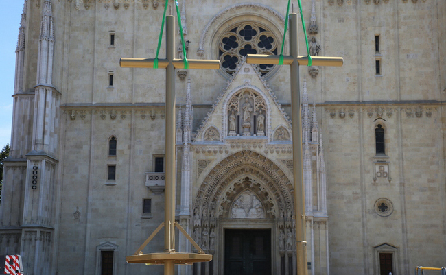 Oštećeni bi zvonici Zagrebačke katedrale, ukoliko to dopusti vrijeme, već danas trebali dobiti zamjenske križeve. “Križevi osim vjerske imaju i praktičnu ulogu jer između ostalog služe kao gromobrani, te dodatno učvršćuju tornjeve”, pojasnio je glavni projektant obnove katedrale arhitekt Damir Foretić. Kape koje se nalaze na križevima će učvrstiti gornji dio kamena, a cijeli križ će biti i gromobran, rekao je Foretić i pojasnio kako je sama konstrukcija križa s kapom teška 780 kilograma. “Naime, radi se o čeliku koji je obojan lakom u zlatnu boju. Visina križa iznad kape je šest metara, a raspon