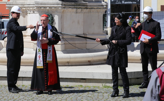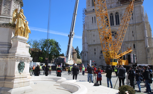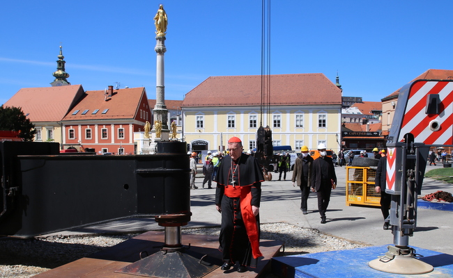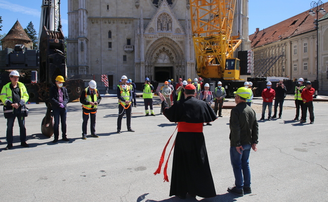 Na prijedlog zagrebačkog nadbiskupa kardinala Josipa Bozanića u 12 sati na Vazmeni četvrtak, 16. travnja, zaustavljeni su radovi na gradilištu kod Zagrebačke katedrale te su se kanonici Prvostolnog kaptola zagrebačkog, radnici i u radove uključeni stručnjaci okupili oko kipa Blažene Djevice Marije ispred katedrale gdje je kardinal Bozanić predvodio molitvu i blagoslov radnika i gradilišta uoči zahtjevne akcije uklanjanja vrha sjevernog zvonika katedrale oštećenog u potresu 22. ožujka.