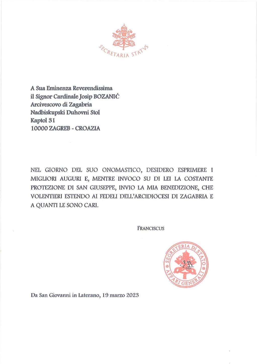 Povodom imendana papa Franjo, udjeljujući svoj blagoslov i vjernicima Zagrebačke nadbiskupije, uputio je čestitku zagrebačkom nadbiskupu kardinalu Josipu Bozaniću.