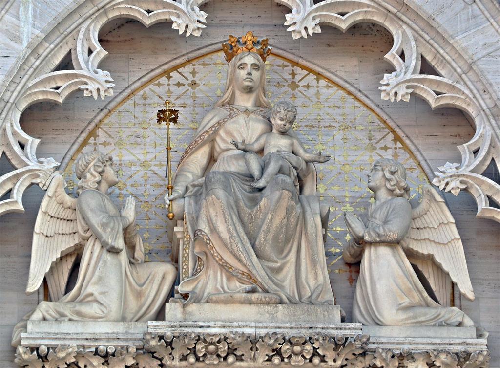 U timpanonu (između sjevernog i južnog zvonika) nalazi se kip Bogorodice s djetetom Isusom i anđelima; svetkovinu Marije Bogorodice Crkva slavi se 1. siječnja.