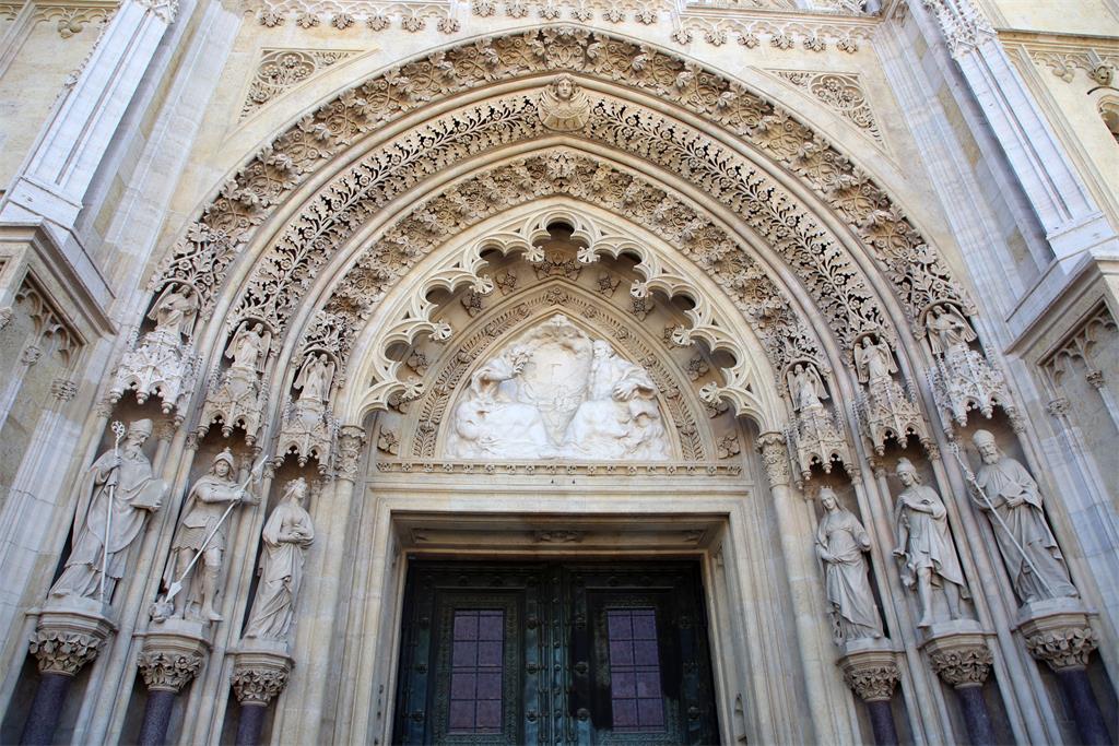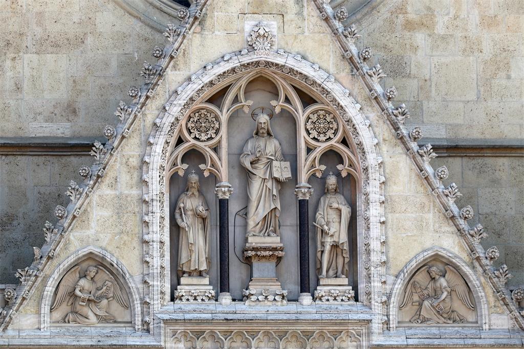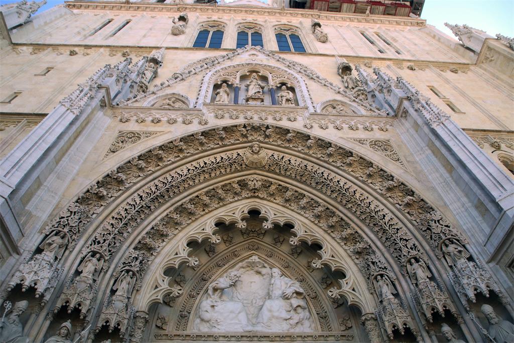 Iznad ulaza u katedralu, u zabatnom trokutu ističu se tri kipa: Krista Učitelja (u sredini) te svetih kraljeva: Stjepana (desno) i Ladislava (lijevo). U kutovima trokuta nalaze se prikazi dva anđela koji u svojim rukama drže ispisano