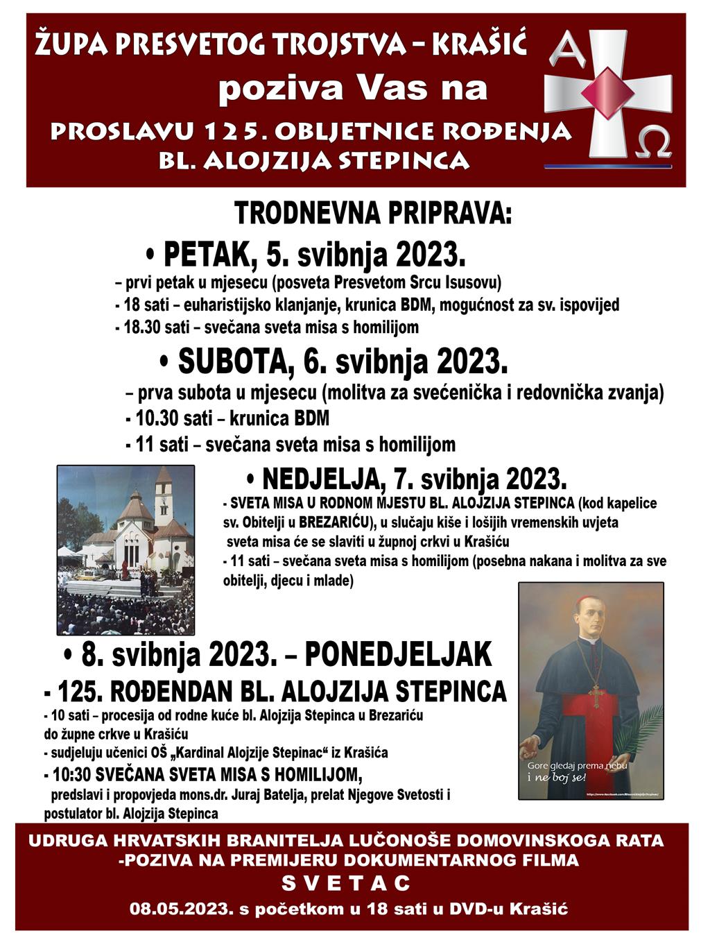 Drugi dan trodnevne priprave uoči proslave 125. obljetnice rođenja bl. Alojzija Stepinca, u subotu 6. svibnja, prva subota u mjesecu (molitva za svećenička i redovnička zvanja), slavit će se hodočasnička svečana sveta misa u 11 sati u Župi Presvetog Trojstva u Krašiću. Misnom slavlju prethodit će krunica BDM od 10.30 sati.